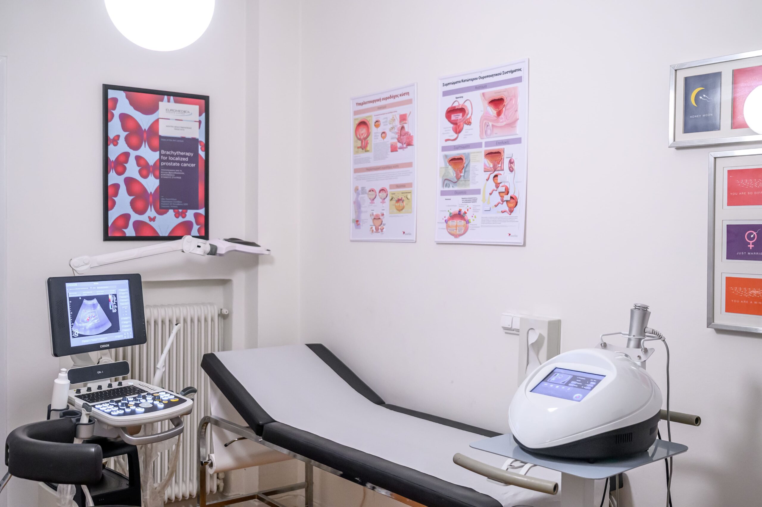 Σύγχρονο ιατρείο ουρολογίας στο κέντρο της Θεσσαλονίκης, με πλήρη εξοπλισμό για διάγνωση και μικροεπεμβάσεις.